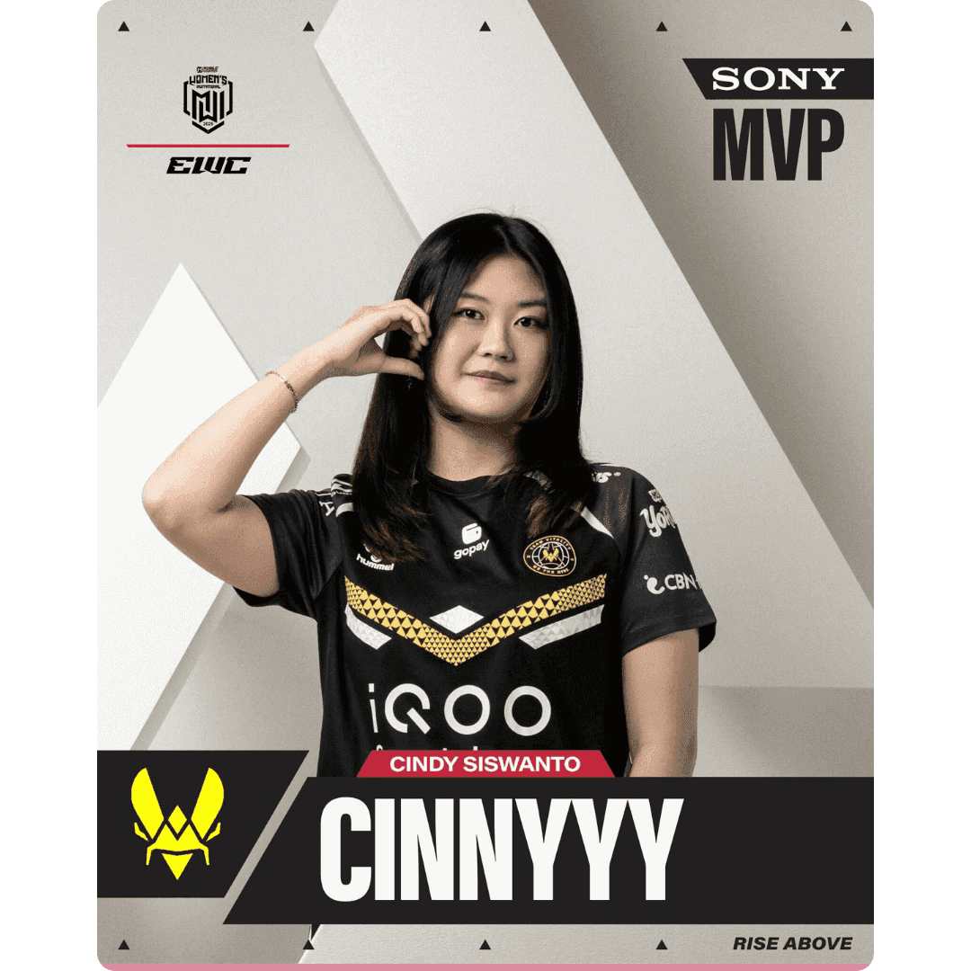 فرضت Cinny سيطرتها الكاملة على مجريات بطولة MWI ضمن كأس العالم للرياضات الإلكترونية 2025 (EWC)، حيث كانت العنصر الأبرز في تشكيلة Team Vitality. تألقت بشكل لافت في النهائي الكبير أمام Gaimin Gladiators، وخصوصًا في الخرائط الافتتاحية التي شهدت أداءً هجوميًا حاسمًا منها، حيث قادت فريقها للفوز في المواجهات الجماعية وحسم الجولات. بفضل هذا الأداء اللافت، نالت Cinny عن جدارة لقب Sony MVP لبطولة MWI في كأس العالم للرياضات الإلكترونية 2025.