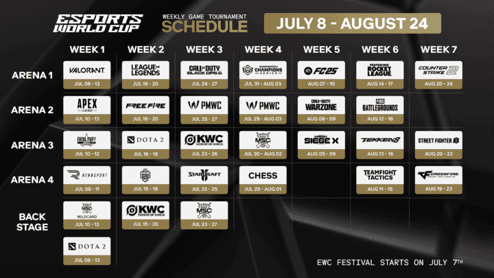 With the schedule locked, the stage is set for seven weeks of world-class competition. The initial wave of tickets are now on sale, and the countdown is on for the biggest celebration of esports, kicking off with the EWC Festival on July 7. Below is the schedule for each EWC tournament.